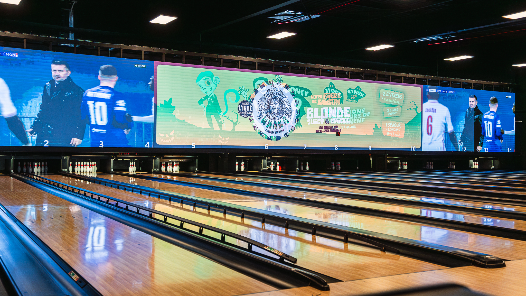 Juste au dessus, l’un des plus grands écrans au dessus d’un bowling d’Europe avec diffusion de événements sportifs majeurs (Ligue 1, Ligue des champions, Top14, grand prix F1, etc.).